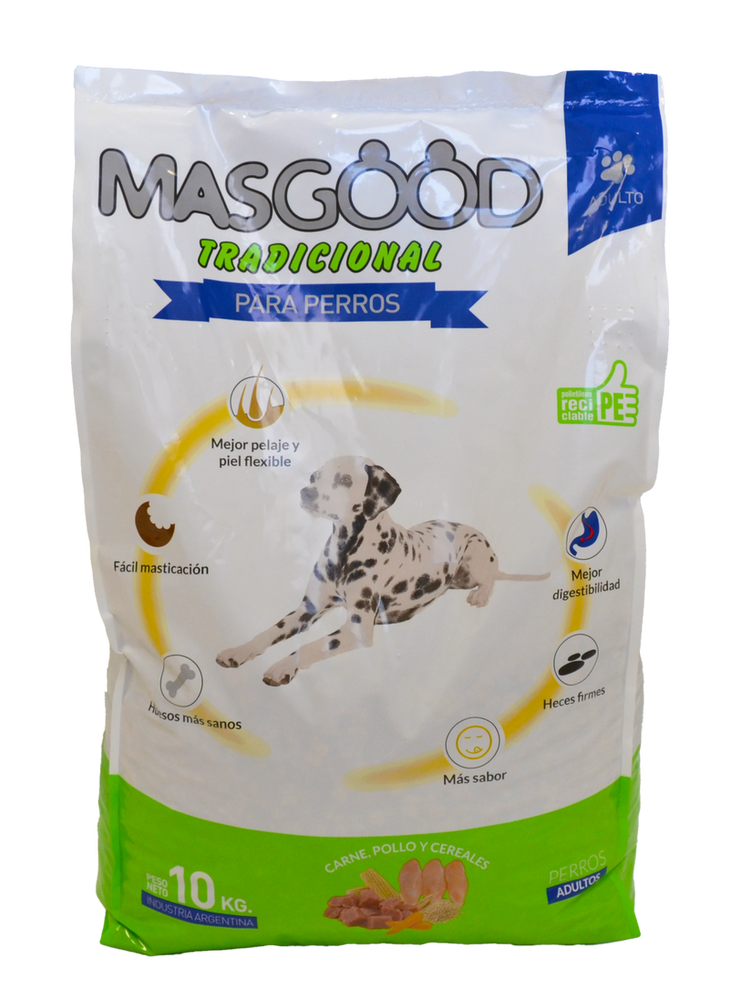 Alimento balanceado para perros adultos de razas medianas y grandes. Masgood Tradicional brinda una nutrición básica y completa, ideal para mantener la energía, la digestión saludable y el bienestar general del perro. Presentación de 10 kg, pensada para un consumo práctico y accesible sin resignar calidad.