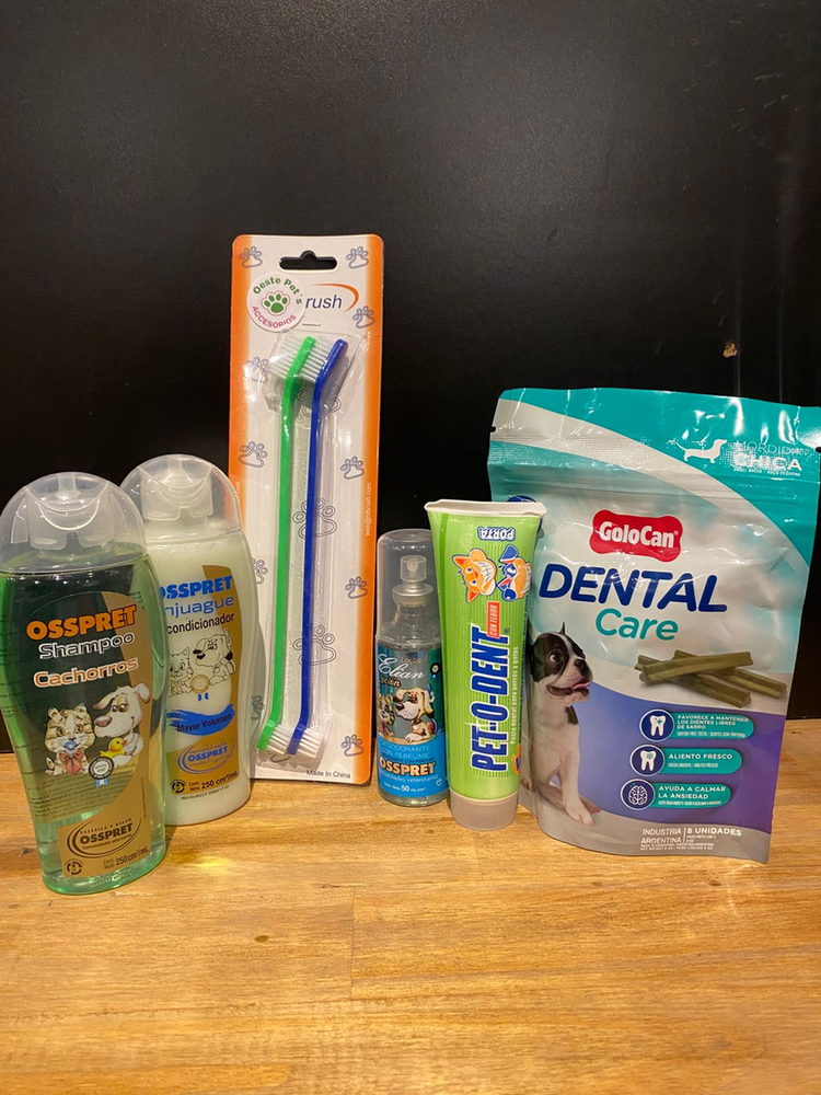 ✅ Shampoo OSSPRET Cachorros ✅ Enjuague / Acondicionador OSSPRET ✅ Cepillos dentales dobles ✅ Pasta dental PET-O-DENT ✅ Desodorante perfume OSSPRET ✅ Snacks dentales GoloCan Dental Care