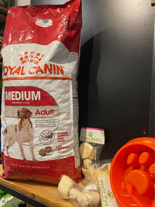 🐶 Incluye: ✔️ Bolsa Royal Canin Medium Adult 15 kg – Nutrición premium para perros medianos ✔️ Plato come lento – Ideal para mejorar la digestión y evitar ansiedad al comer ✔️ 2 huesos prensados – Perfectos para entretener y fortalecer dientes ✔️ 5 orejas naturales – Snack irresistible y saludable