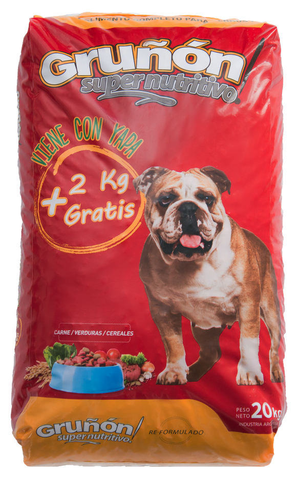 Alimento completo para perros adultos de razas medianas y grandes. Masgood Gruñón Supernutritivo brinda una nutrición equilibrada que favorece la salud digestiva, mantiene la vitalidad y contribuye a un pelaje sano. Su fórmula está enriquecida con proteínas, vitaminas y minerales esenciales. Presentación de 22 kg (bolsa de 20 kg más 2 kg de regalo), ideal para quienes buscan rendimiento y calidad en un solo producto.
